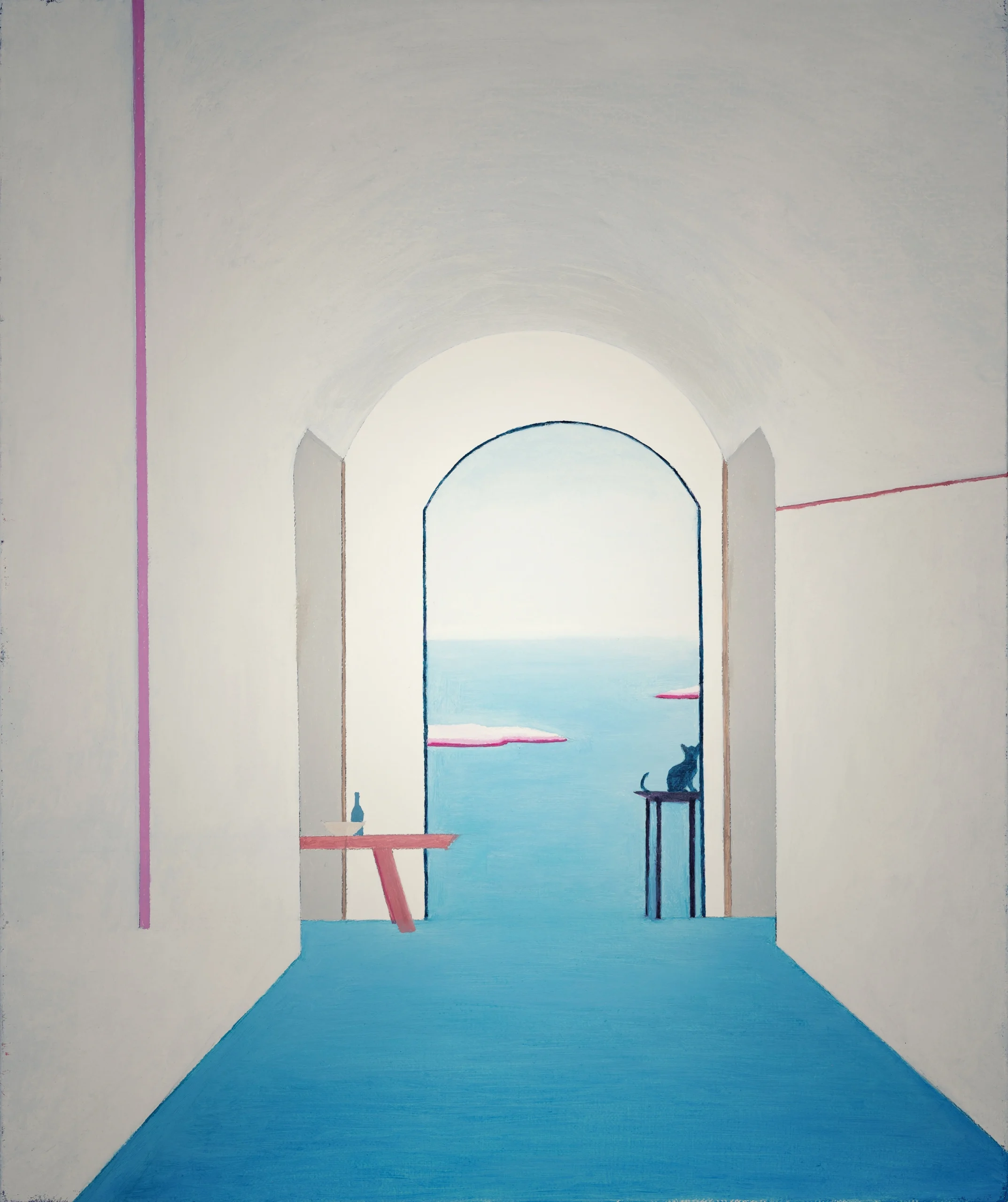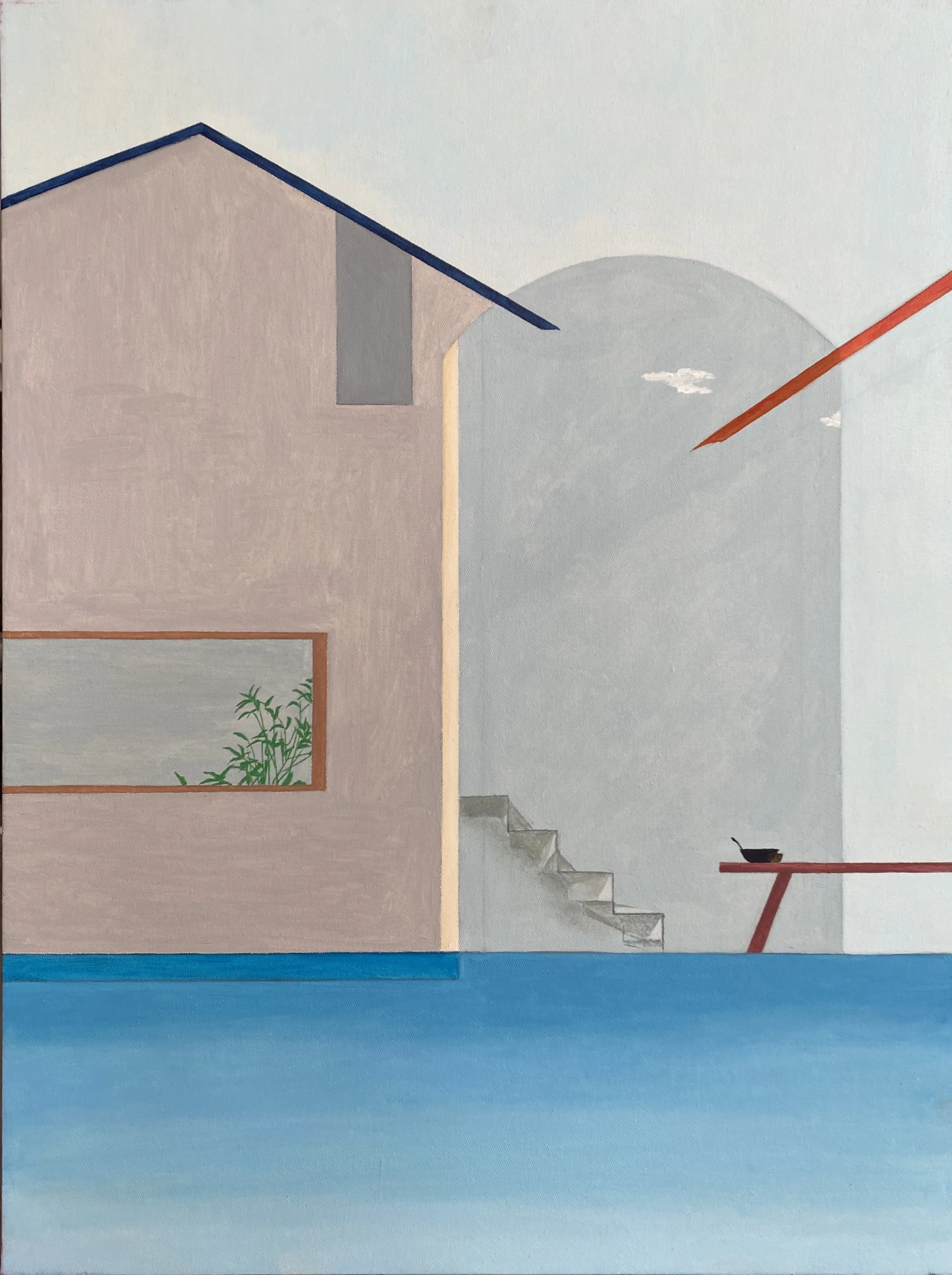 His paintings, on the other hand, distill his photographic experience, reconstructing personal memory through highly saturated colors and geometric compositions.
